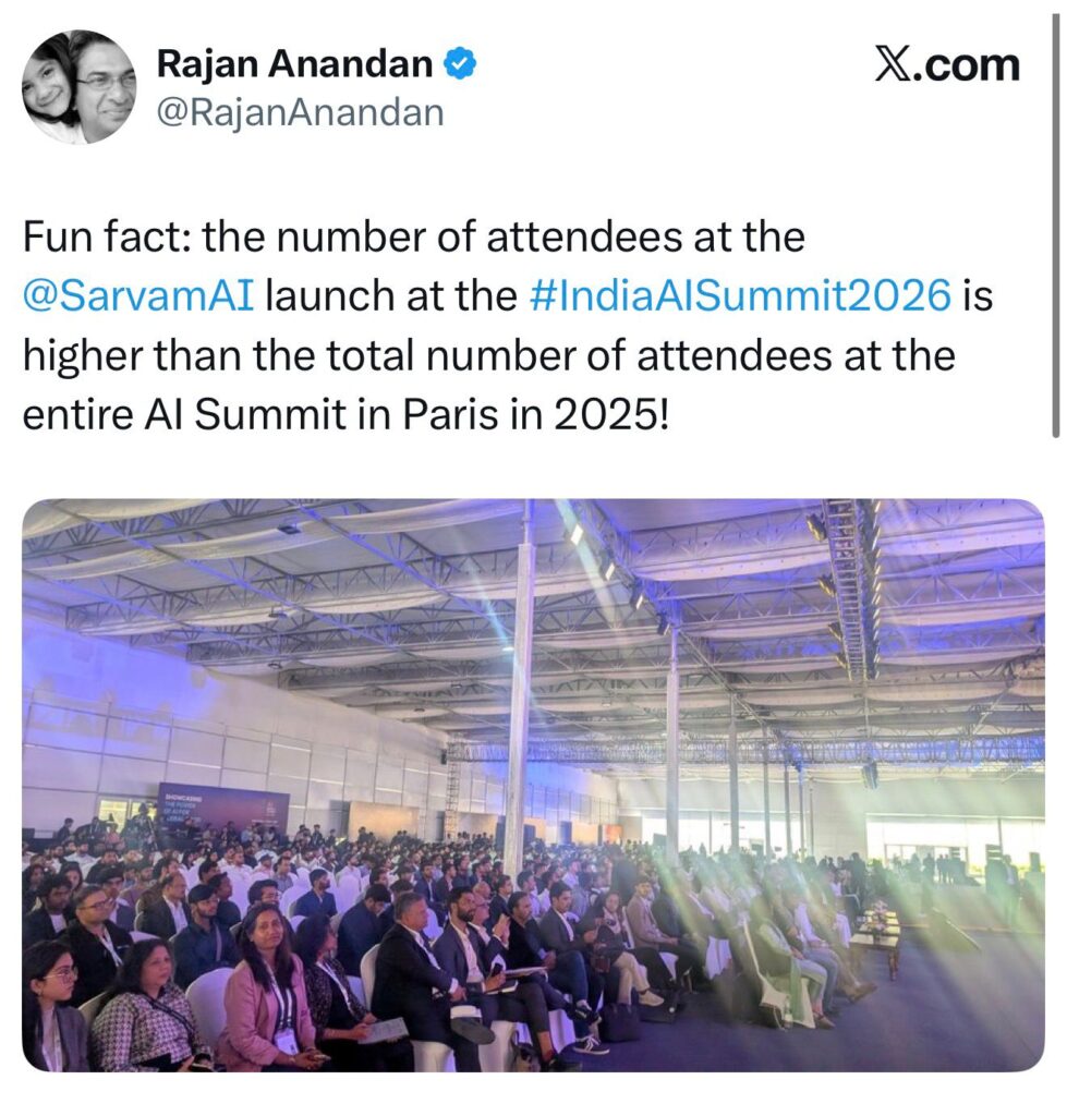 Venture capitalist Rajan Anandan, who leads Surge at Peak XV Partners, pointed out a striking detail. The crowd at the Sarvam AI product launch alone outnumbered the total attendance of the entire Paris summit. That single observation captures the energy and confidence flowing through the venue.